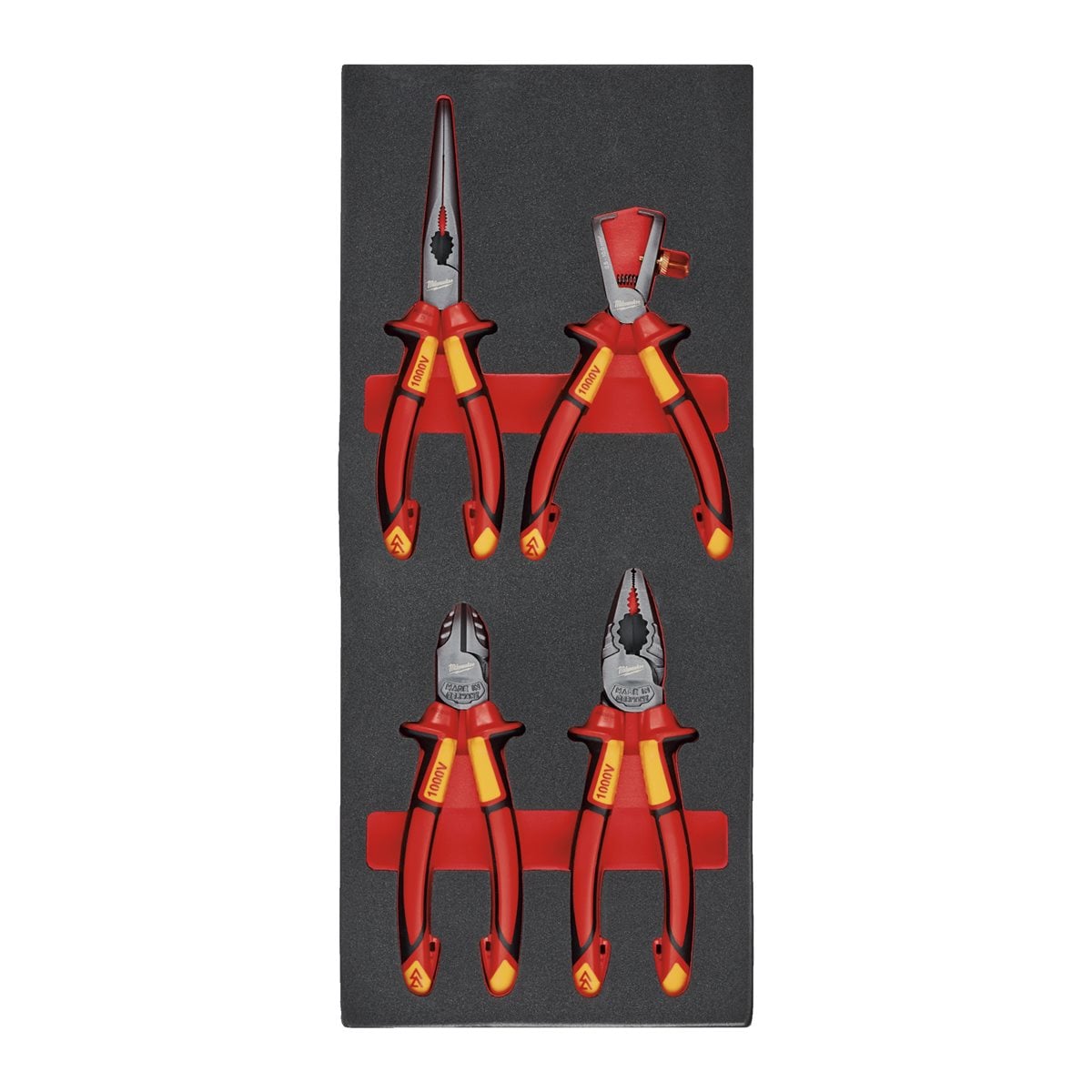 Milwaukee Pěnová vložka sada kleští VDE 4ks - boční štípací 160mm, pro mechaniku 205mm, kombinované 180mm, odizolovací 160mm