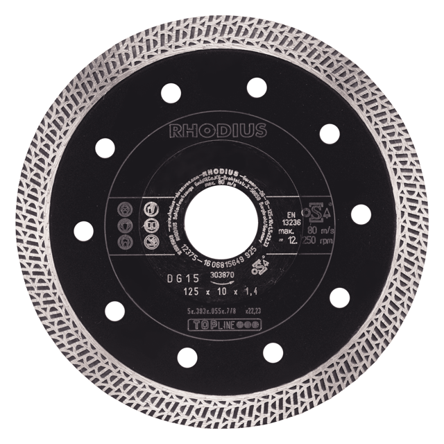 Se šířkou segmentu 1,4 mm dosahuje DG15 velmi vysoké řezné rychlosti. Také díky speciálnímu diamantovému pojivu u 10 mm vysokého segmentu je obzvlášť vhodný pro řezání tvrdých pálených keramických obkladů, kameniny a keramiky. Zde využívá jeho celou sílu a zároveň přesvědčí velmi malou tvorbou prachu při suchém řezání. S jeho zesíleným ocelovým jádrem zaručuje DG15 přesný průběh řezu a čisté řezné hrany.